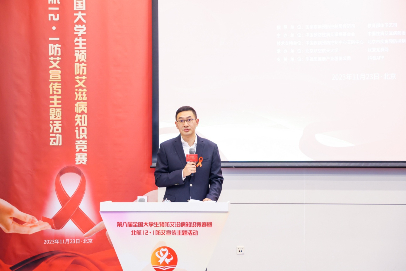 2023年11月23日,在第36个世界艾滋病日来临之际,为持续推进防艾宣传教育进校园工程,提高青年学生对艾滋病的正确认识及自我防护意识和能力,第八届全国大学生预防艾滋病知识竞赛暨北航12·1校园防艾宣传主题活动在北京航空航天大学新主楼第二报告厅举办。