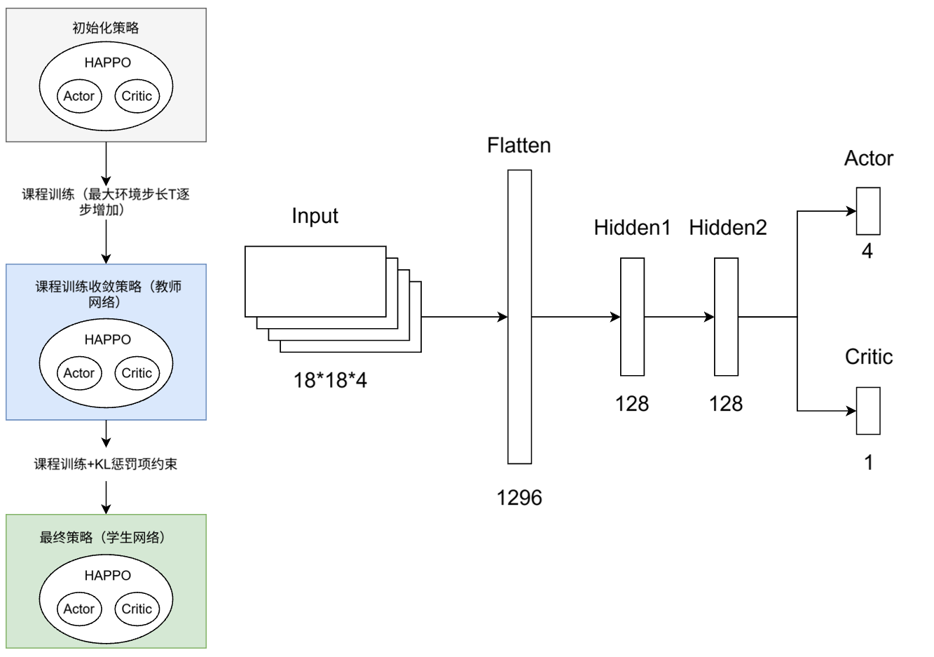 针对未知环境下无人机协同区域覆盖路径规划中训练效率低、收敛不稳定及泛化能力不足等问题,研究团队提出了一种融合课程训练与迭代式师生学习机制的深度强化学习方法。该方法在异构智能体近端策略优化算法基础上,通过设计多阶段课程训练,将复杂覆盖任务拆解为由简到繁的子任务序列,引导智能体逐步完成从简单环境到复杂环境的过渡学习。同时,将前期课程中已收敛的模型作为教师网络,通过知识蒸馏指导学生网络继续训练,从而提升复杂任务中的初始探索效率,减缓策略退化问题,增强模型对不同环境的适应能力。