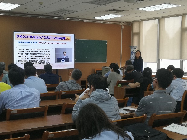 接着王少萍书记给全体党员宣贯了学校2021年全面从严治党工作会议精神,分别传达了校党委书记曹淑敏、校长徐惠彬与校党委副书记、纪委书记何新洲的讲话精神,重点解读了校党委书记曹淑敏指出的几点要求,要准确把握全面从严治党新部署新要求,充分认识学校全面从严治党新形势新挑战,扎实做好2021年全面从严治党的各项工作。要努力把全面从严治党的成果,转化为为促进学院和学校“双一流”建设的成果。