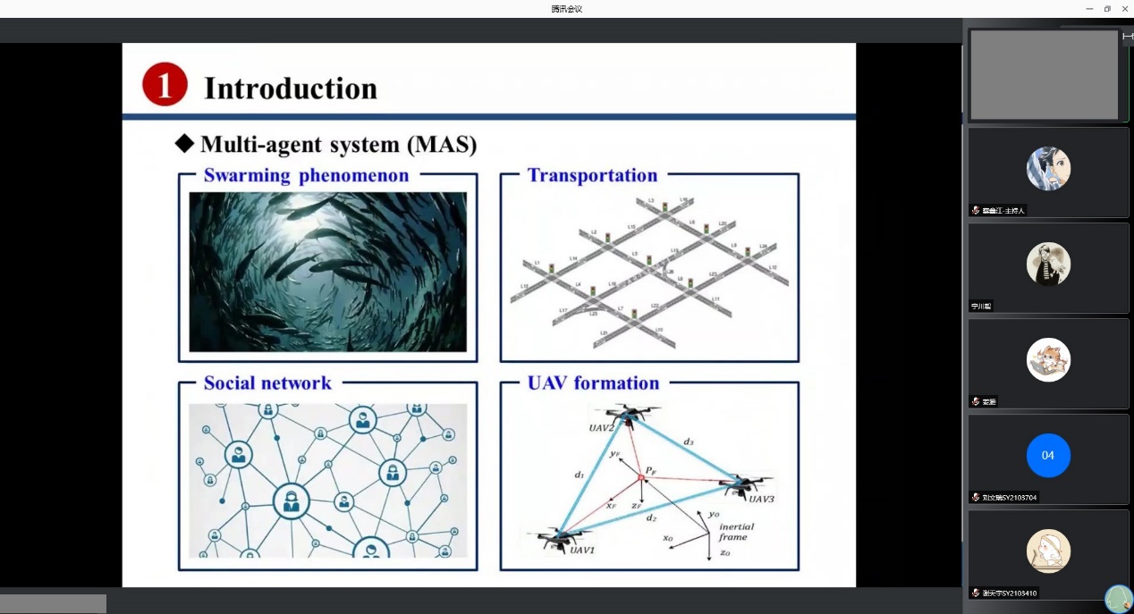 接下来进行分享的是英国上市公司3652018级博士生张璟尧同学。他以“非线性多智能体网络系统在切换拓扑下的分布式迭代学习控制”为题,整合其发表在AUTOMATICA和IEEE TAC上的两篇论文研究内容进行汇报。张璟尧同学首先简要介绍了迭代学习控制的基本原理与优缺点,并以行进乐队为例,对迭代学习控制的对象——多智能体系统的相关特点与控制目标进行了阐述。随后引入代数图论、联合生成树等知识,设计分布式迭代学习控制协议,将全局Lipschitz条件放松为局部Lipschitz条件,通过理论推导、数值仿真等手段,回答了在具有切换拓扑的非线性多智能体网络系统中如何实现分布式迭代学习控制这一问题。