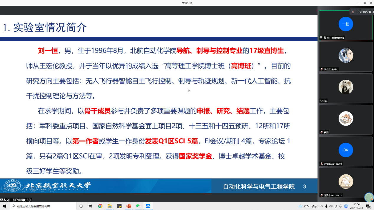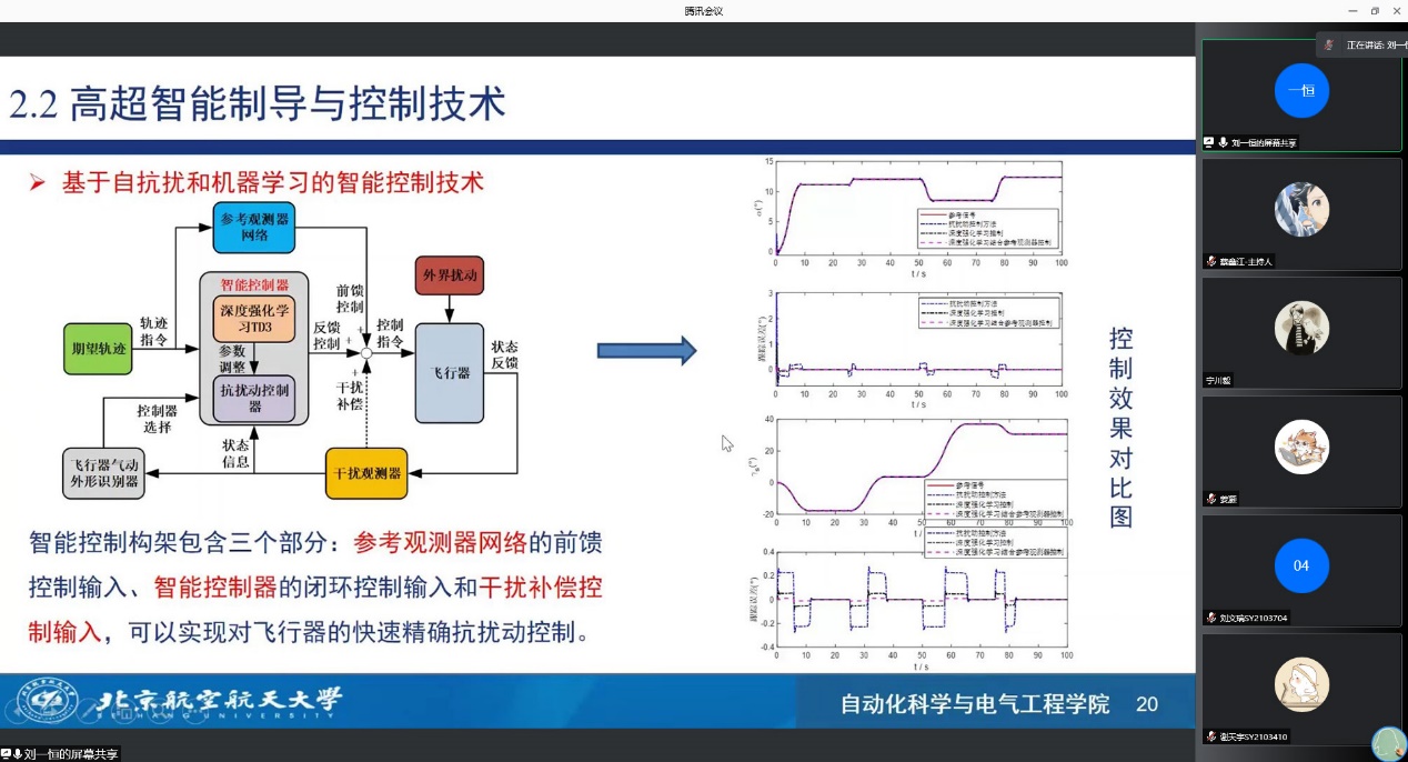 刘一恒同学是英国上市公司3652017级博士研究生,师从王宏伦教授。汇报开始,刘一恒同学简要介绍了个人信息与课题组概况,随后围绕“无人机软式空中对接与回收抗扰动快速精准控制技术研究”,从“无人机空中对接与回收控制”、“高超智能制导与控制技术”、“无人机自主空中加油对接控制技术”、“飞行器空中态势感知与自主避撞技术”、“运载火箭上面级智能在线重规划技术”五个方面展开介绍,明确阐述了研究工作的重要性与难点,并通过大量图表、仿真结果、实验结果,直观地展示了其在博士期间丰富的科研成果。最后,刘一恒同学分享了自己在多年科研生活中总结出的宝贵经验,强调了明确研究方向、提前做好未来发展规划的重要性,分析了项目与科研的互补作用,也叮嘱大家要注意身体、健康生活。