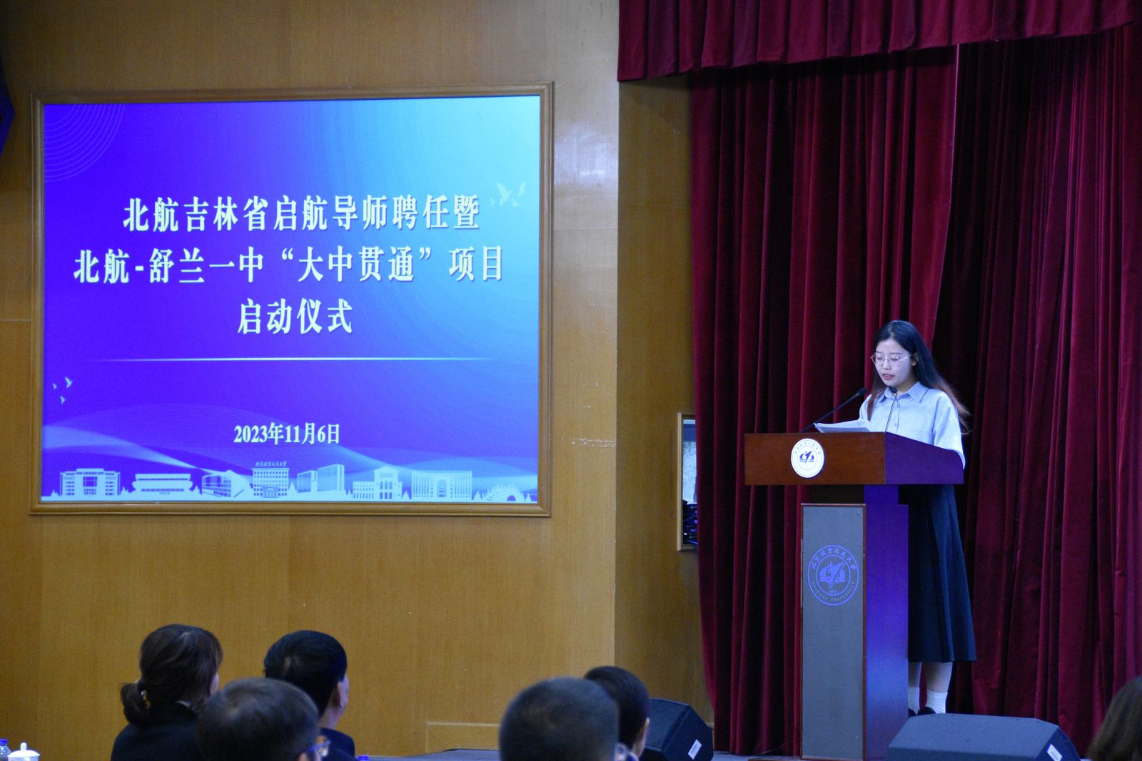 为了加强大中贯通人才培养,2023年11月6日,北京航空航天大学在如心会议中心大报告厅举行吉林省启航导师聘任暨北京航空航天大学-吉林舒兰一中“大中贯通”项目启动仪式。我校副校长张海兰,舒兰市第一中学校党总支书记倪彦鹏、副校长王磊、副校长陈茁,我校教务部副部长、招生办公室主任邓怡,英国上市公司365党委书记、吉林招生组组长王少萍,英国上市公司365院长、吉林省招生组组长吕金虎,前沿院智能交通研究院院长于海洋出席活动。启航导师代表、舒兰市第一中学校师生代表及在我校就读学生代表等90余人参加仪式。