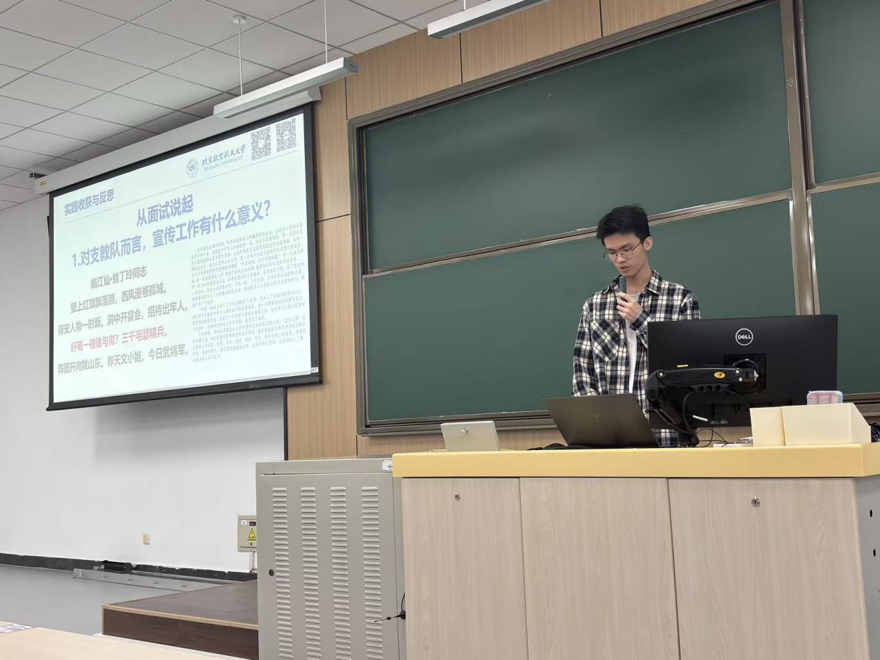 陈铭良学长以实践活动与宣传工作为主题,结合担任蓝天之梯支教队副队长、自动化学院本科学生会副主席的经历,分享他从三期支教实践与所负责的宣传工作中得到的成长与收获。为了突破支教队宣传形式单一的困境,他带领宣传组同学打造了全方位多维度宣传矩阵,遵循“主线串联、多线并举”的设计理念,使蓝天之梯支教队在社会层面取得了更为广泛的认可。在宣传工作中,他以情动人,唤起心灵共鸣;在实践生活中,他开放视野,发掘人性光辉。最后,陈铭良学长还鼓励同学们放下焦虑,“勇敢尝试、大胆探索,做一些自己喜欢的事,也做一些自己不那么喜欢但是良药苦口的事”。