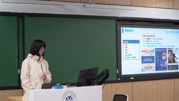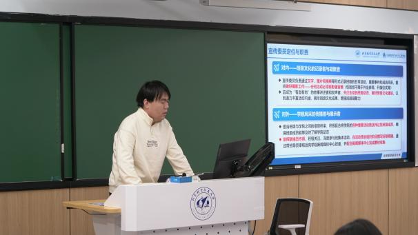 培训中,学院研究生会主席团成员武洁宇首先介绍了自动化学院新闻宣传发布的规范流程,明确了宣传委员的角色定位与工作职责。